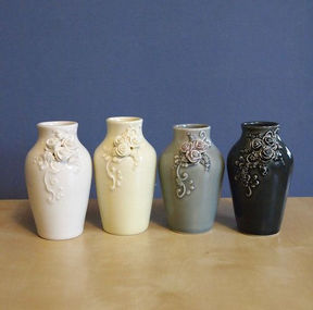 JaMpdx is the collaboration of Jenn Gauer and Meghan Radick, two friends who have been making functional and decorated ceramics together since 2004. Jenn uses a fine porcelain and throws the pieces on a potter’s wheel, and Meghan decorates them using cake decorating techniques (imagine an actual pastry bag and all the different metal tips, but instead of buttery frosting we use clay). Each bowl, cup or vase feels great and looks elegant—this is art that you are meant to use and enjoy! JaMpdx has been with Mossy Creek Pottery since 2017.